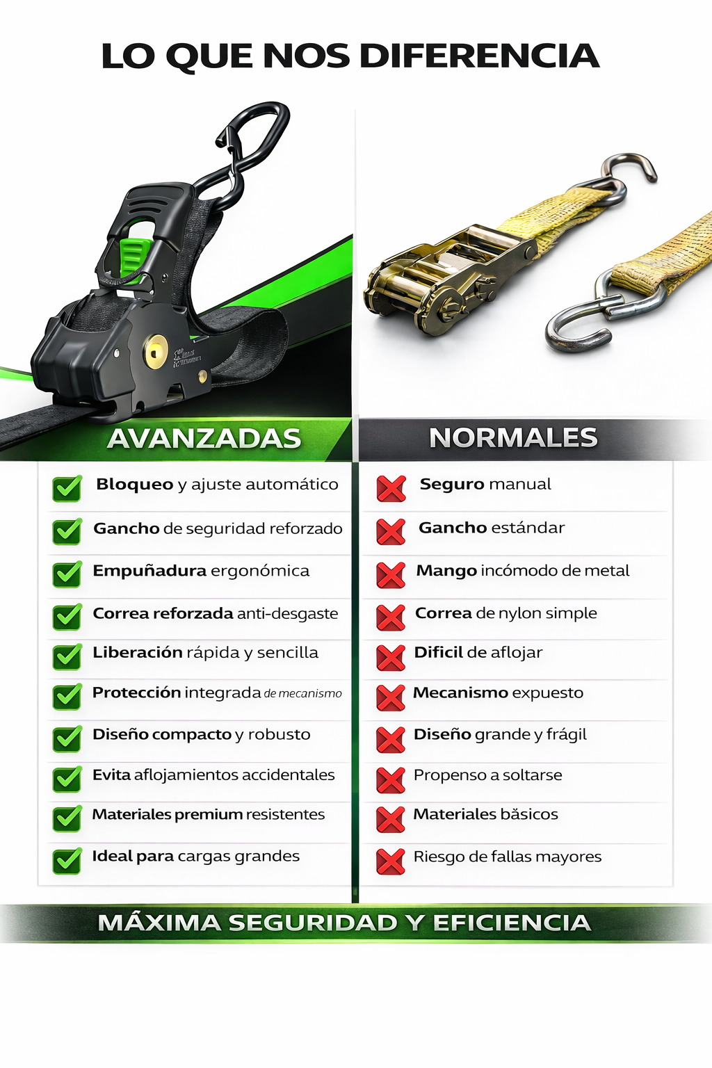 A diferencia de las cinchas convencionales, esta versión incorpora ganchos de acero templado con cierre de seguridad integrado, diseñados para resistir la tensión constante sin deformarse ni abrirse.